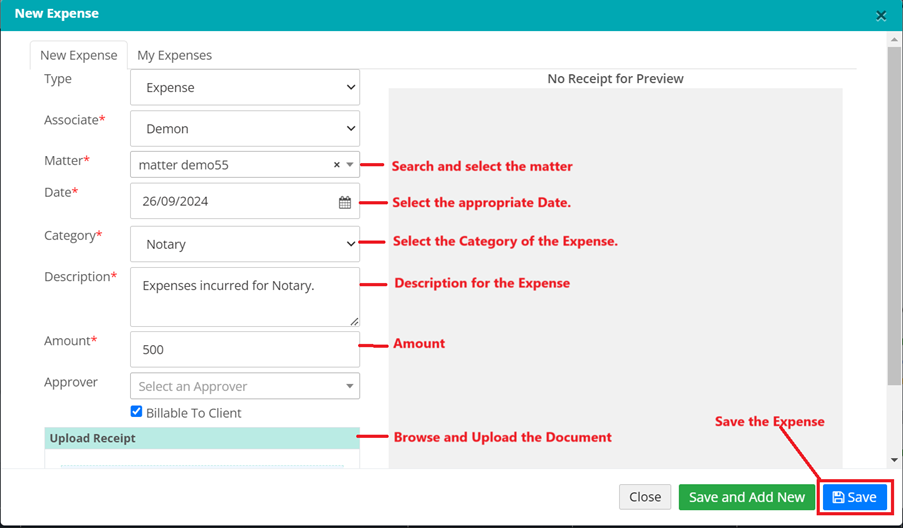 - In the Expense Window enter the highlighted fields and hit on save button.