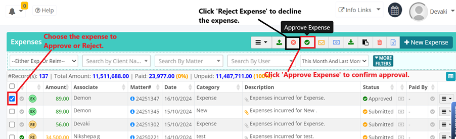 To Approve/Reject any expense, follow the steps below,