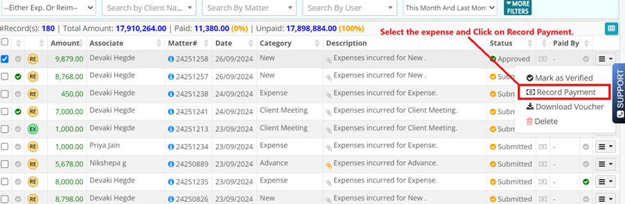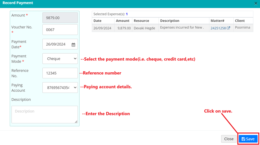 Any expense is paid by accounts team can be updated to LegalXGen along with the necessary information like, Mode of Payment (Cash/ Check/ Bank Transfer etc.).