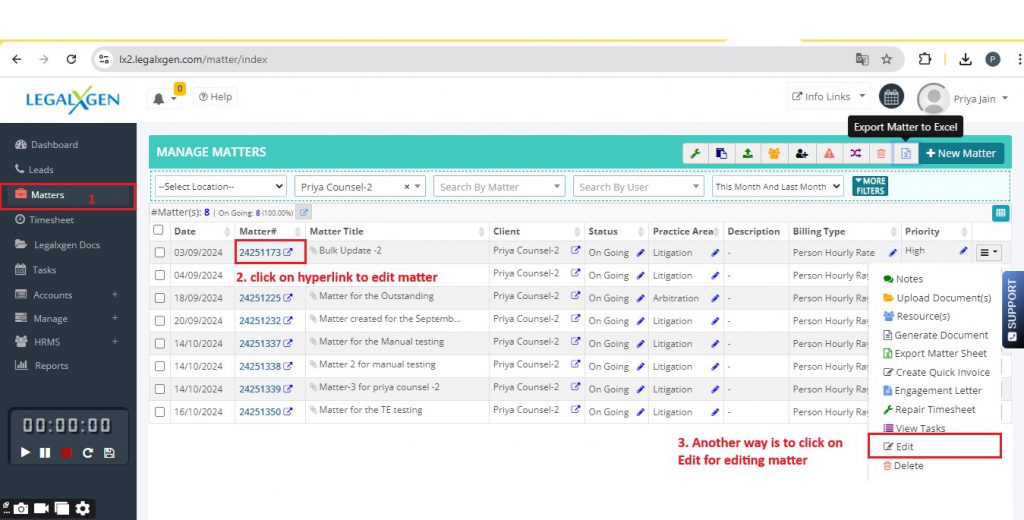 5. Once you’ve identified/ located the matter you wish to edit, click on either Matter Code given as hyperlink.
