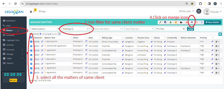 - You’ll see a list of matters. You may apply appropriate filters to search for the desired matters you wish to merge.