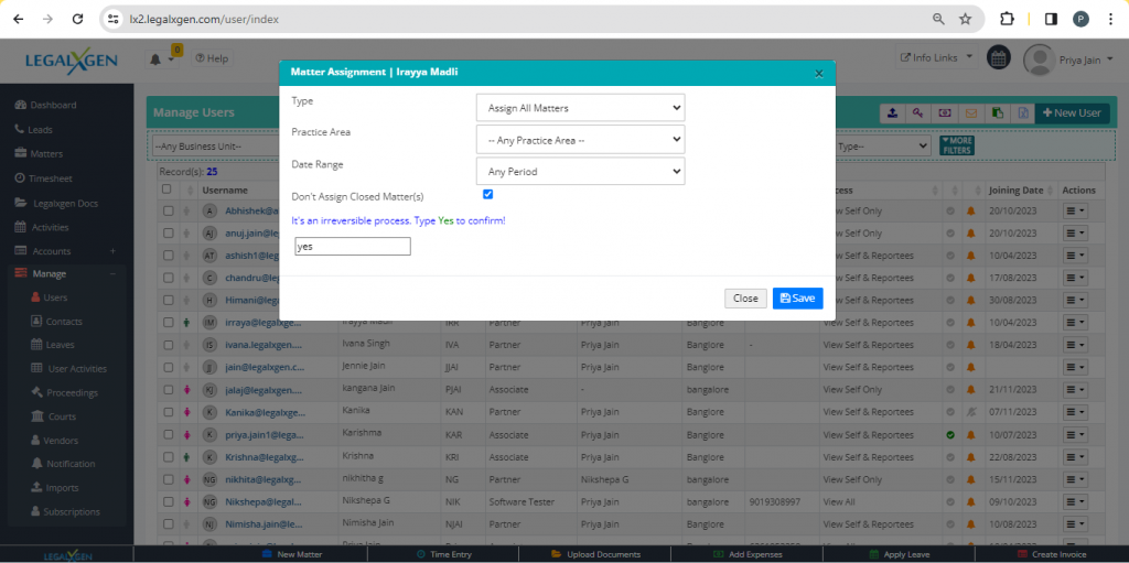 5. You’ll be presented a new window where you need to choose the appropriate option for the matter assignment & type ‘YES’ & SAVE
