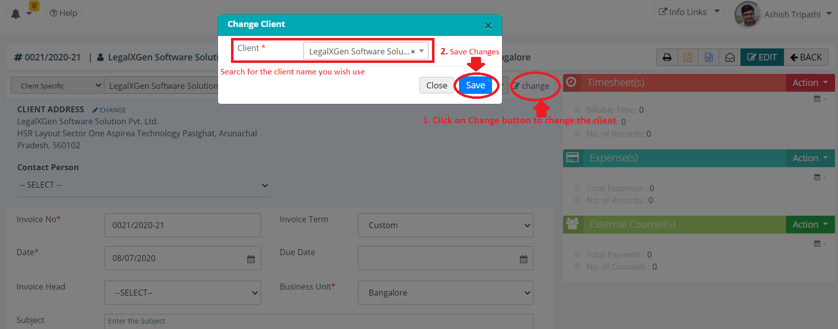- Identify the invoice which for which you wish to change the client. Click on Invoice No