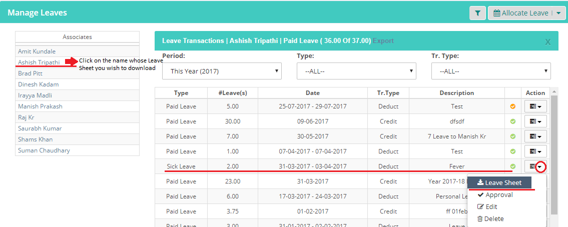 5. Go to last column (Action) of the leave transactions, you’ll an option ‘Leave Sheet