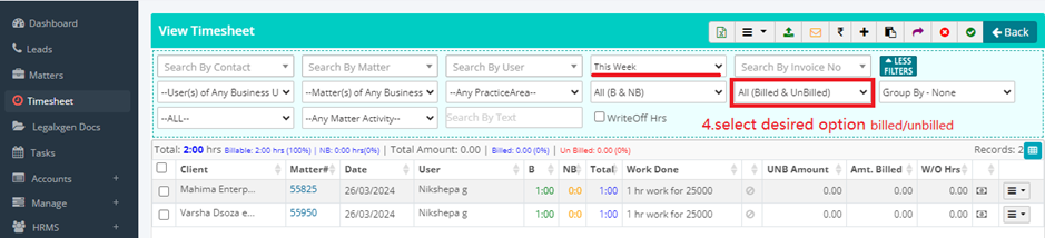 5. After clicking the more filter, you’ll see few more filters (drop down list) in the second line, choose your desired option (All, Billed or Un-Billed)