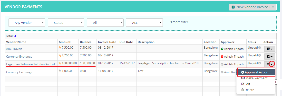 - Locate/Identify the invoice you wish to ‘Approve‘ or ‘Reject‘. Click on the ‘Action’ column present in the last column. You’ll see an option ‘Approval Action‘, click the same.