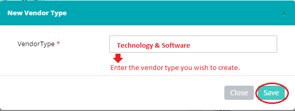 - You’ll be presented a window, enter the type of vendor you wish to create and click on ‘Save’ button.
