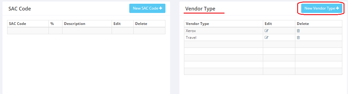 - Scroll down to locate the panel ‘Vendor Types‘, click on the ‘New Vendor Type‘ button.