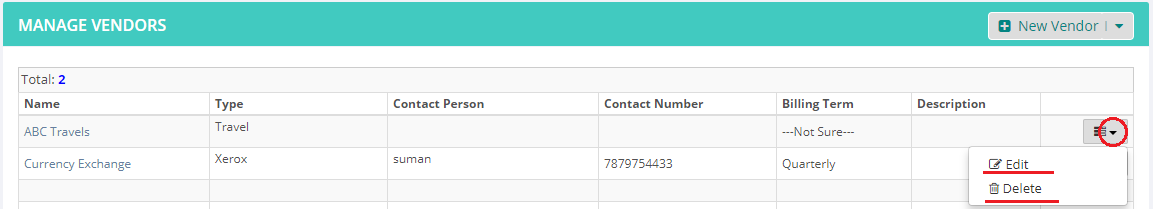 4. Identify the vendor you wish to edit/ delete. Click on the Action column present in the last. You’ll see options to Edit or Delete any vendor. Choose the action you wish to perform (Edit/ Delete)