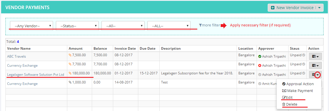 3. You’ll see all the vendor invoices listed over here. You may apply appropriate filter to search your invoice. Locate the invoice you wish to edit/delete.
