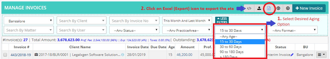 5. Select desired aging option. You’ll see the filtered invoices as per the criteria selected.