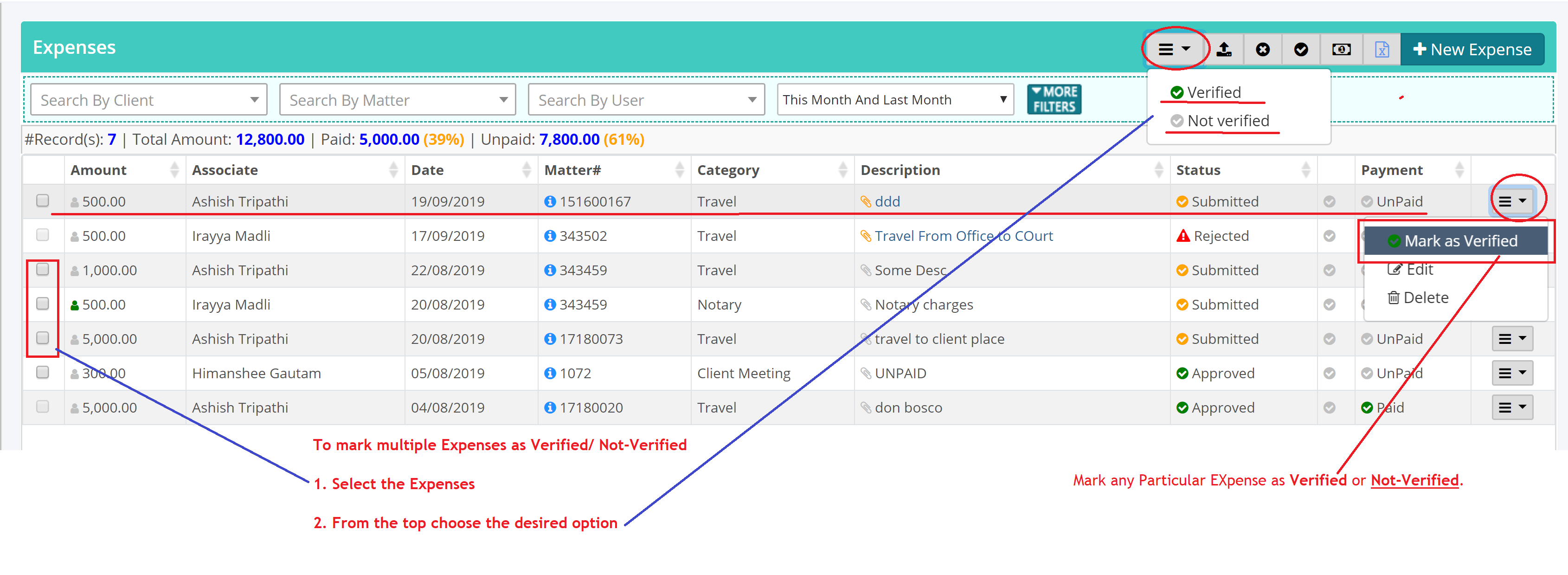 - Similarly to mark Multiple Expenses as Verified/ Not-Verified, you may select the Expense(s) and then from the top select the appropriate option.