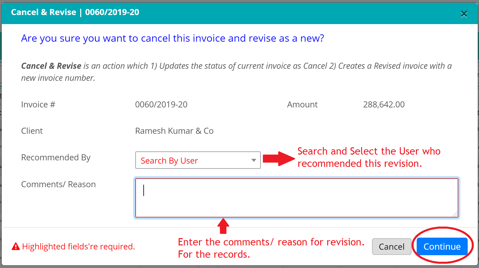 - It’ll bring a new window. Confirm that you want to Cancel and Revise it. Also, you need to enter who’s recommended to Revise this invoice and Reason/ Comments. Once entered it, click on ‘Continue’ button.