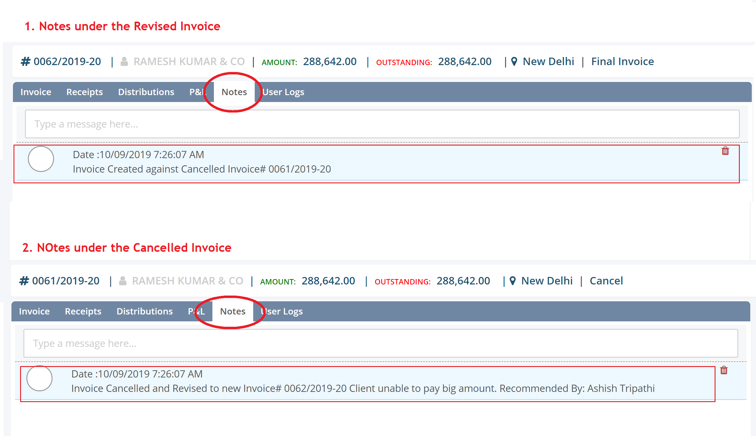 - To see the Revision notes you may go to Particular Invoice and click on the ‘Notes‘ tab.