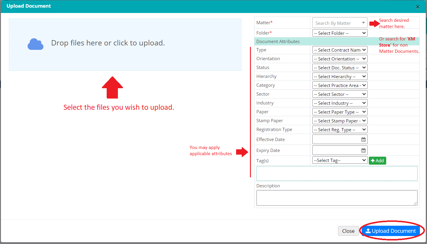 - You may apply relevant attributes to any document being uploaded. Click here to see how to add/edit any items into Document Attributes (Opens in new Window).