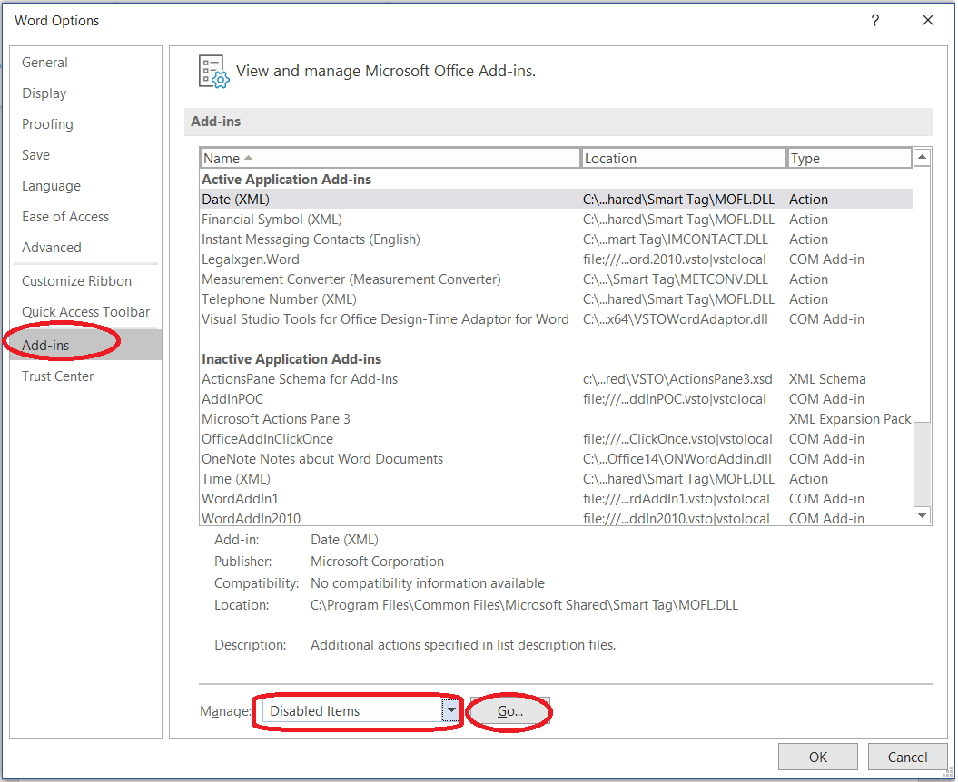 - Into Word Options Window, you’ll see a dropdown Manage at the bottom.
