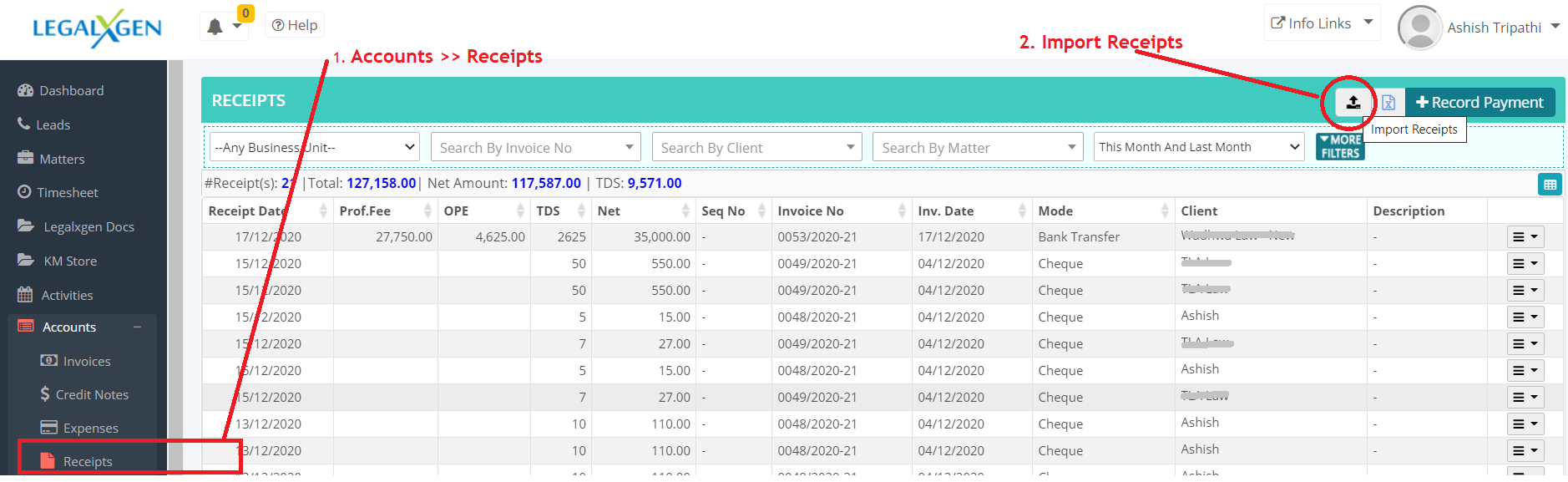 - Go to Accounts >> Receipts