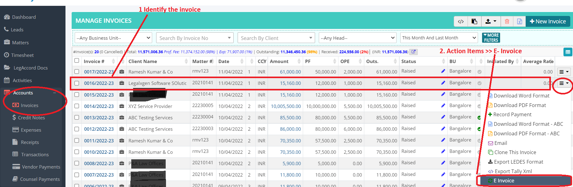 - Identify the invoice that you want to Sync on e-Invoicing portal