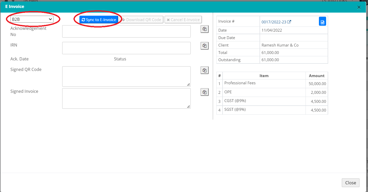 - Once synced, you’ll be provided E-Invoice details such as Ack No etc.