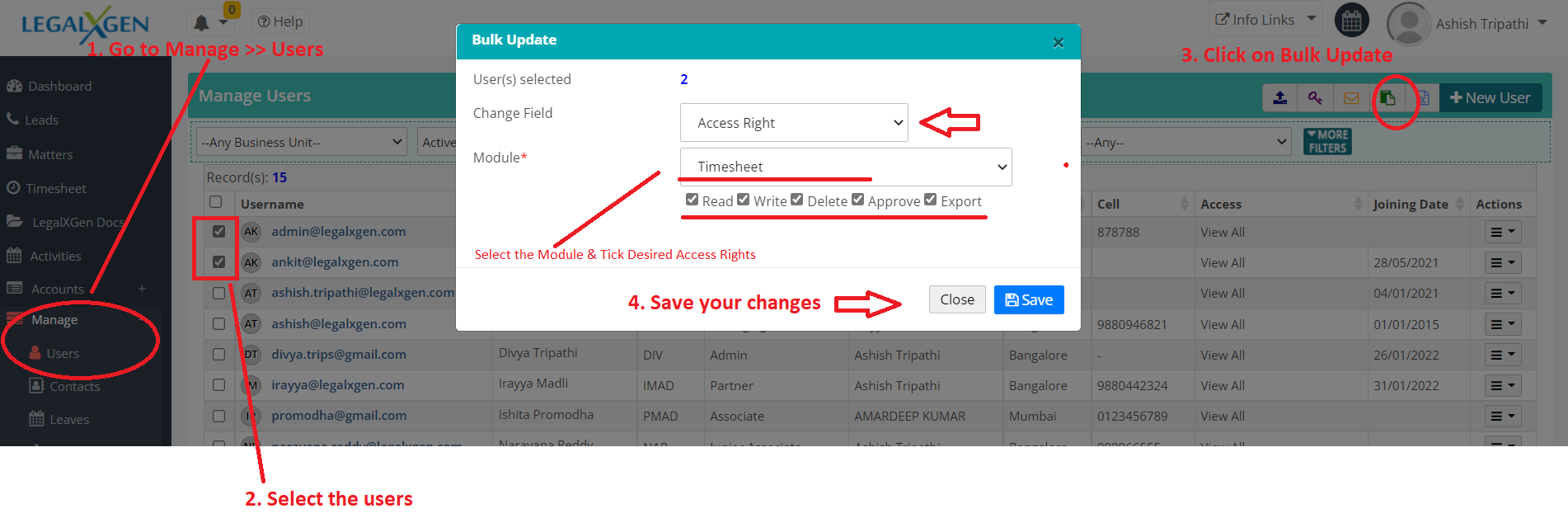3. Search/ identify the users whose access rights you wish to update.